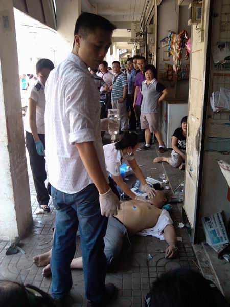 图为该男子倒地后正在接受救助