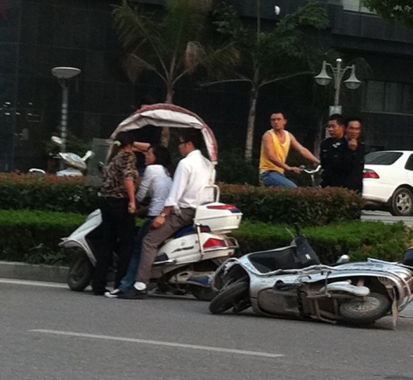昨天下午5时许,在市区二环路两辆电瓶车发生擦撞,其中一辆被撞倒在地。